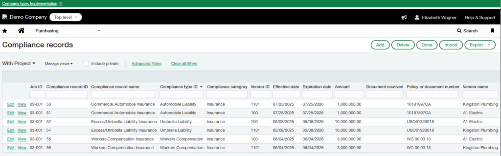 2. Manually key “compliant / not compliant” into Sage for each vendor or job.
