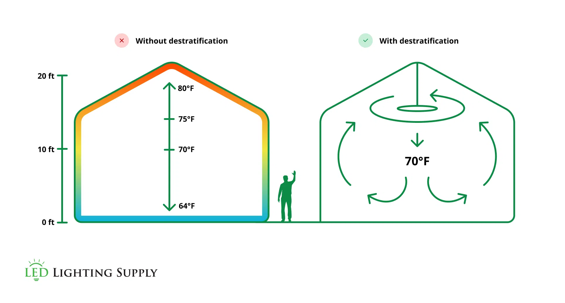 In environments with inadequate air circulation, traditional airflow systems pose several safety risk factors to workers. OSHA requires employers to provide working conditions “free from recognized hazards,” which includes exposure to excessive heat. Employers are required to recognize signs of heat stress and install a proper airflow system to suit thermal comfort levels. HVLS fans are engineered to counter these hazards by generating focused airflow patterns through a destratification process.