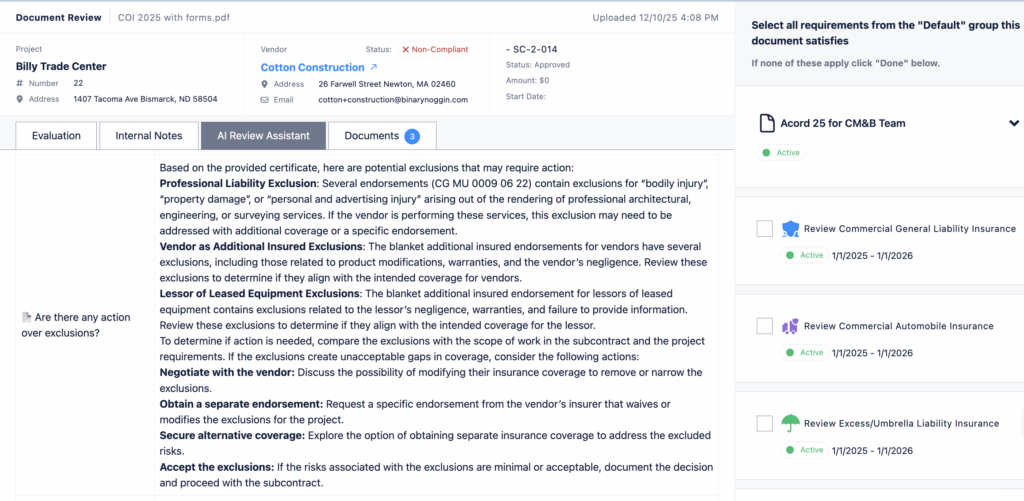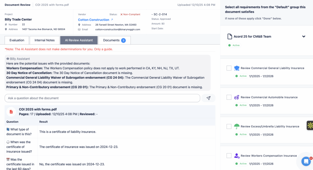 Instant COI review that removes the back and forth, guidance that helps vendors fix their own mistakes, and an AI assistant that answers questions without adding to your workload. Billy’s AI Review Assistant gives you fewer emails to manage, fewer corrections to chase, and a smoother approval process from start to finish.