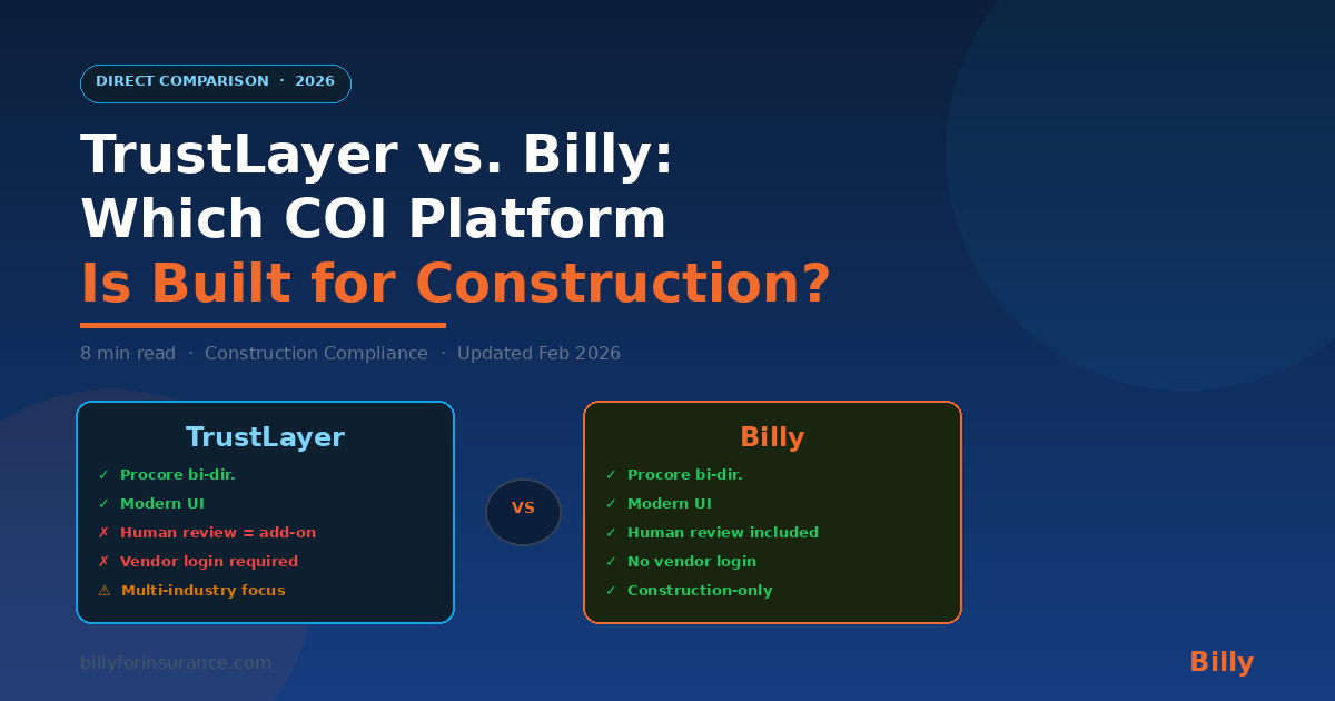 TrustLayer is running aggressive ad campaigns right now. If you’ve searched for COI tracking software recently, you’ve seen them. Their content is polished, their interface looks modern, and their pitch is compelling. But there’s a difference between a platform that looks built for construction and one that actually is. This comparison cuts through the marketing to show where TrustLayer and Billy genuinely differ — and when each one wins.