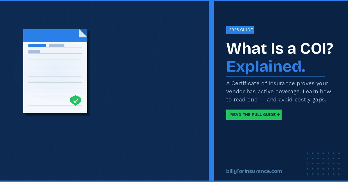 Most insurance brokers can issue a COI within a few hours or the same business day. For urgent requests, a good broker can often turn one around in under an hour. If a vendor is slow to provide one, that can sometimes indicate a coverage issue worth investigating. See our full guide on how to get a certificate of insurance for the step-by-step process.